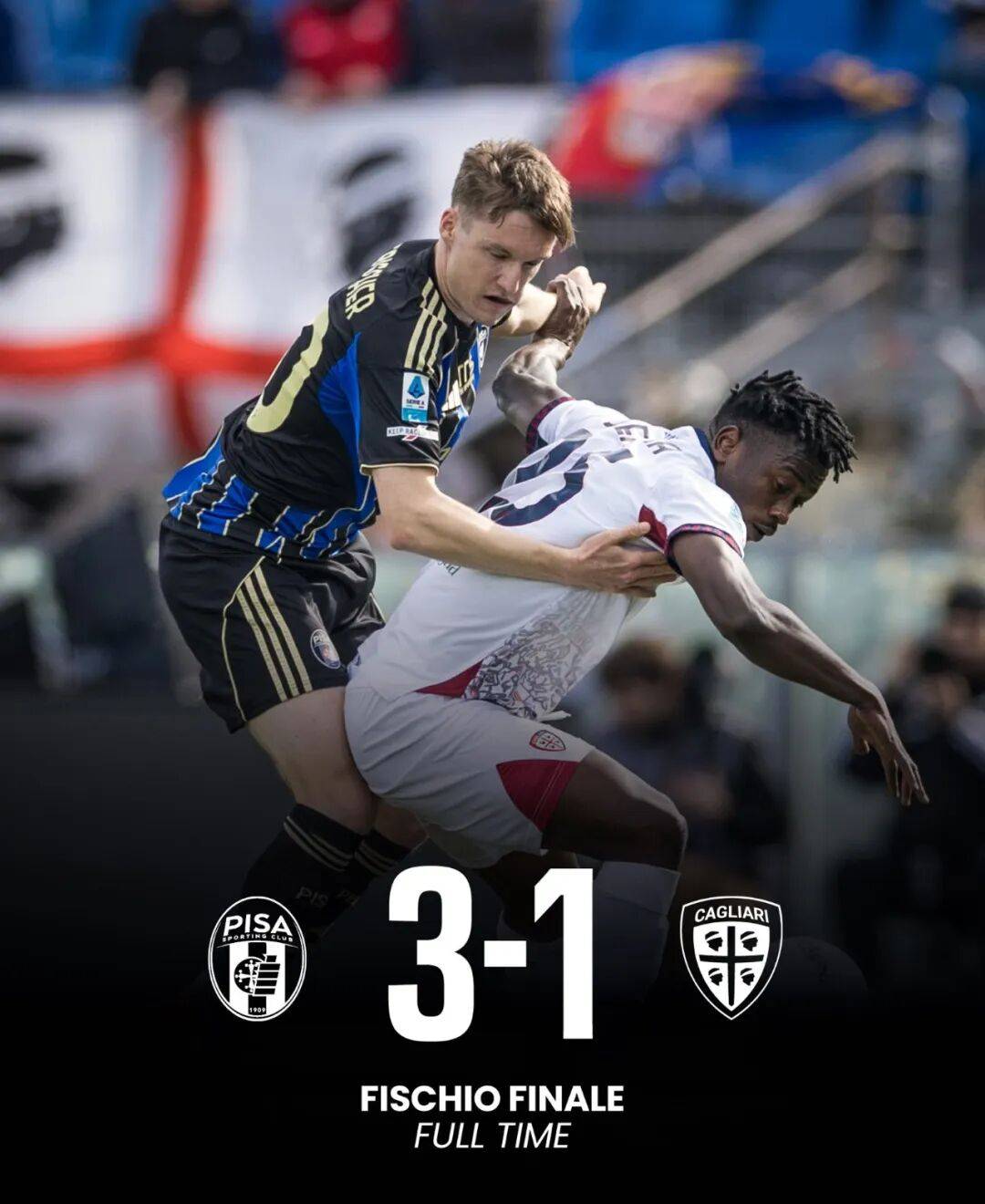 卡利亚里上轮意甲客场1-3不敌比萨遭遇两连败和六轮不胜,他们上次在联赛中获胜还是1月31日。土耳其前锋Semih Kilicsoy取代停赛的埃斯波西托,中场Gianluca Gaetano和中卫米纳伤愈复出。上半场苏莱马纳禁区内对比萨中卫Arturo Calabresi犯规被判点球,莫雷奥点射破门。第37分钟比萨队史标王Rafiu Durosinmi脚踹米纳被罚出场,下半场比萨利用界外球由队长卡拉乔洛扩大领先优势。两分钟后比萨角球进攻,卡拉乔洛头球破门梅开二度。大比分落后的卡利亚里由替补登场的帕沃莱蒂扳回一城,第81分钟卡利亚里的斯洛伐克后卫奥伯特领到第二张黄牌也被罚下,最终大部分时间占据人数优势的卡利亚里客场输球又输人。